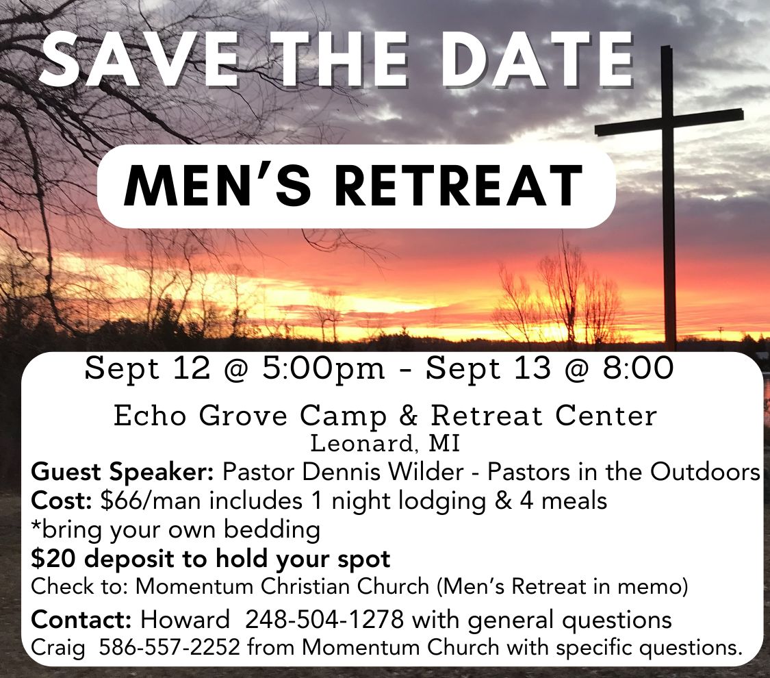 Please make checks payable to “Momentum Christian Church” with “Men’s Retreat” in the memo line. Checks can be given to Craig Pietrangelo or Dorothy @ Momentum. Please contact Craig @ (586) 557-2252 with any questions.